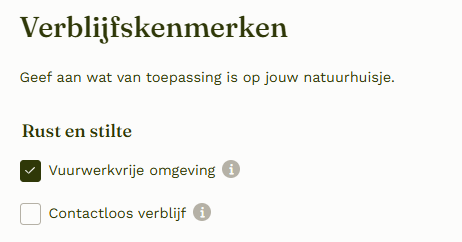 Wil jij graag bij jouw natuurhuisje een vuurwerkvrij verblijf aanbieden? Dit hoef je niet aan ons door te geven. Je kunt dit vanaf nu heel gemakkelijk zelf aanvinken. Dit werkt als volgt: