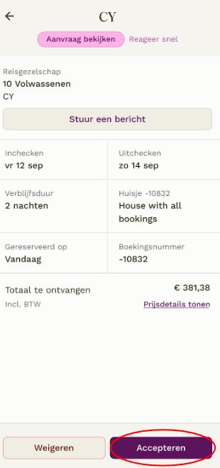 Klik vervolgens op de boekingsaanvraag en onderin kun je de boekingsaanvraag accepteren.