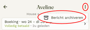Mocht je een berichtje willen archiveren, dan kun je dit doen door het bericht te openen en rechts bovenin op de 3 stipjes te klikken en vervolgens op 'Bericht archiveren'. De berichten komen dan in het mapje 'Archief' terecht.