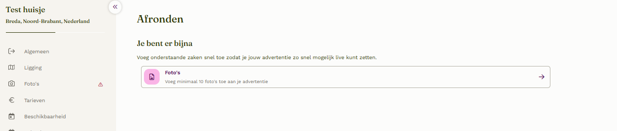 Er moeten minimaal 10 foto's zijn toegevoegd, waarvan minimaal één foto van de buitenkant is van het natuurhuisje. Zo krijgt de gast een goed idee van de ligging van jouw natuurhuisje! Voeg verder ook foto's van het interieur en de omgeving toe, zodat gasten een goed beeld krijgen van jouw natuurhuisje. Let er wel op dat foto's op de advertentie geen logo's of watermerken mogen bevatten!